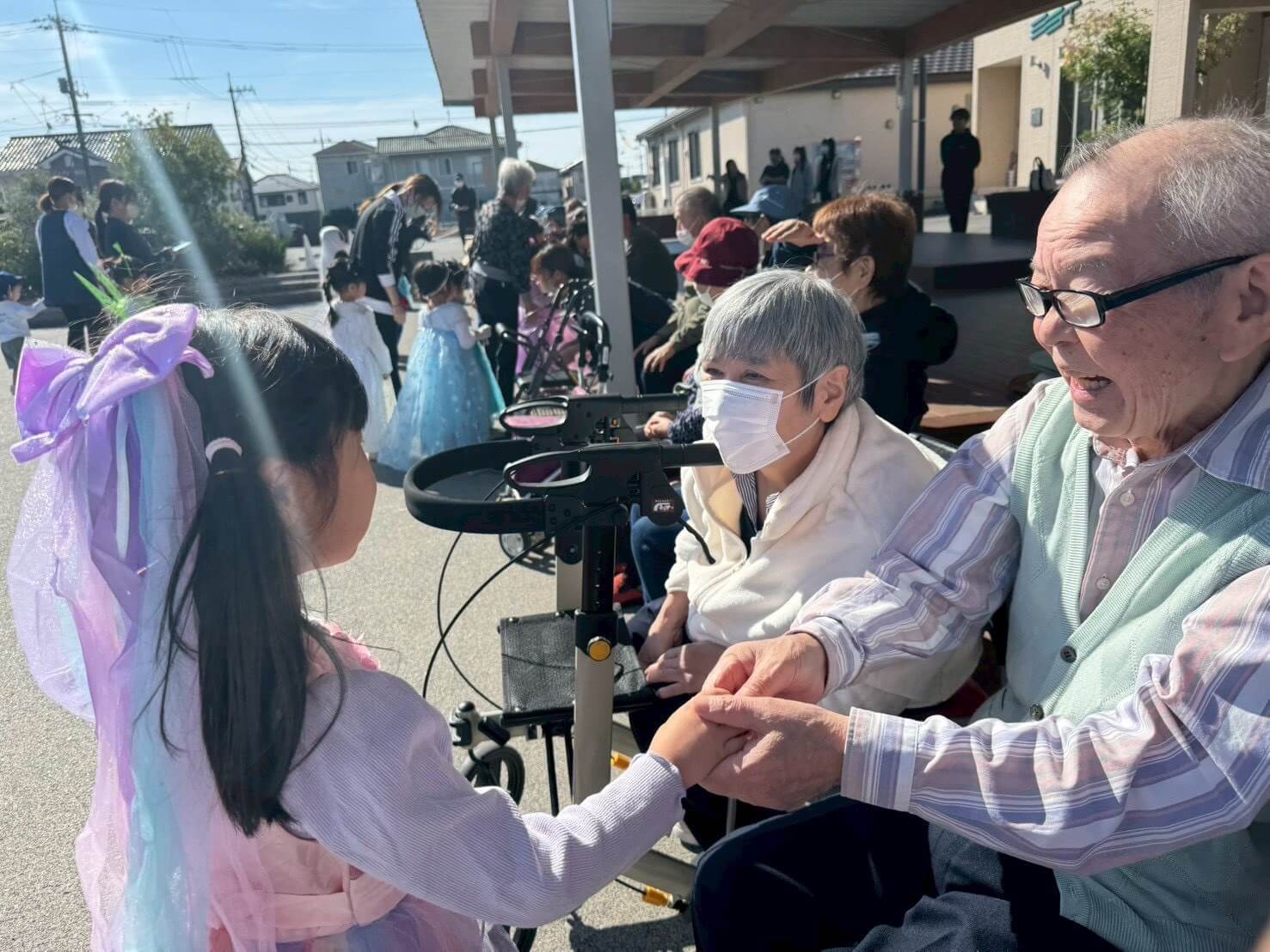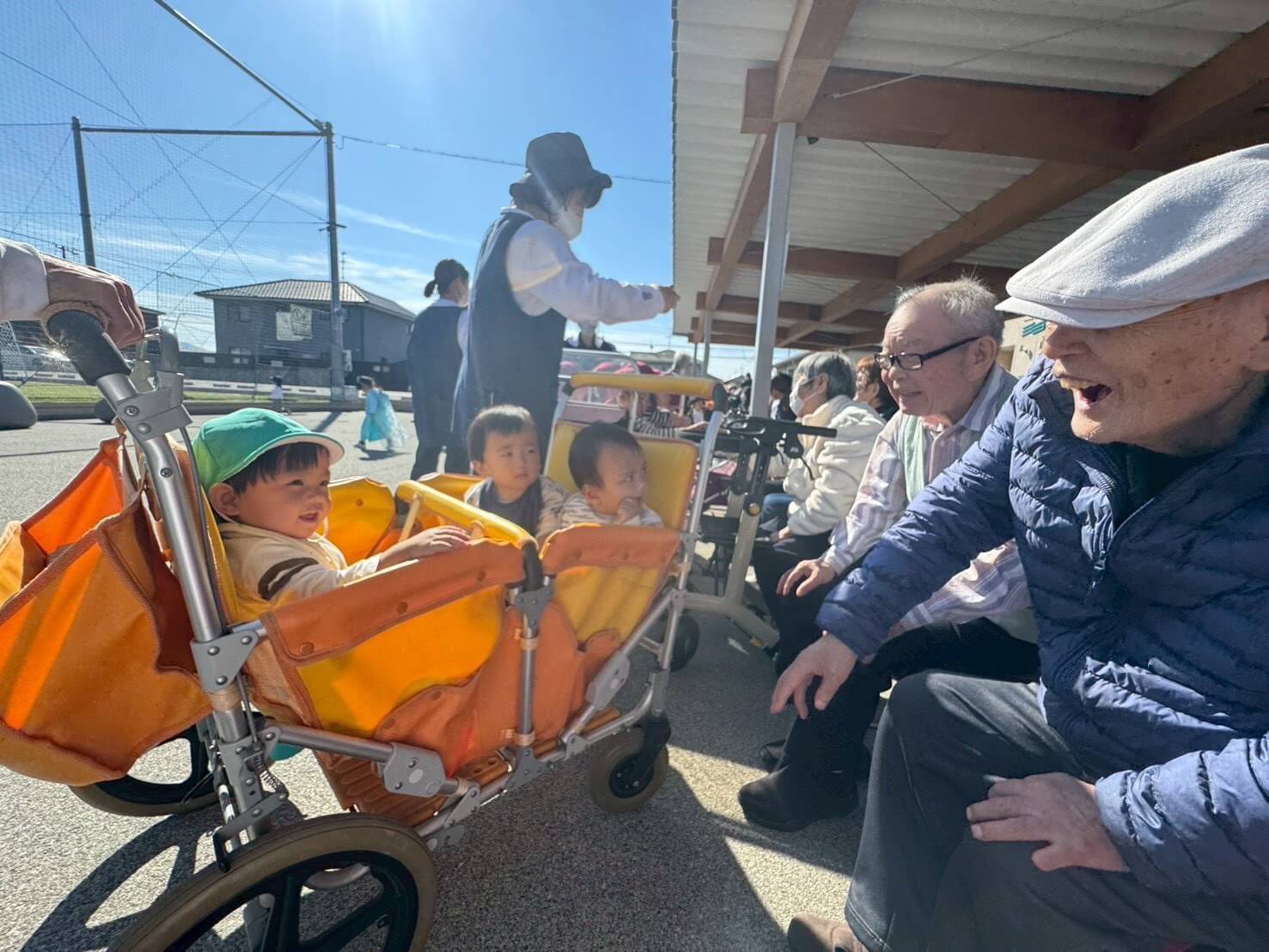 園外交流では万倍の里を訪れ、おじいちゃん・おばあちゃんと一緒にラジオ体操や会話を楽しみ、温かい交流の時間となりました。