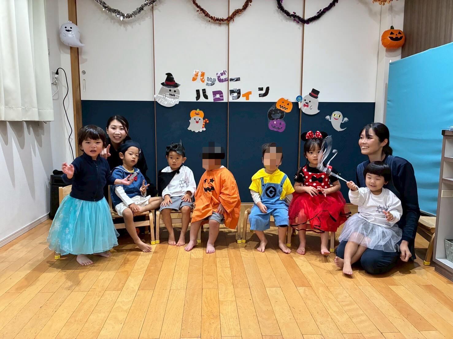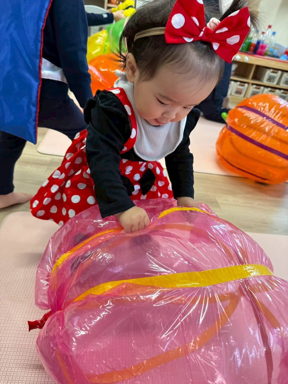 カラーポリ袋で作ったかぼちゃバルーン遊びや、お菓子をめぐるちょっとしたハプニングもあり、子どもたちは最後まで笑顔いっぱい。雨でお散歩パレードはできなかったものの、室内で十分にハロウィンを満喫することができました。