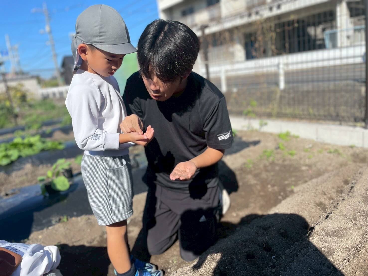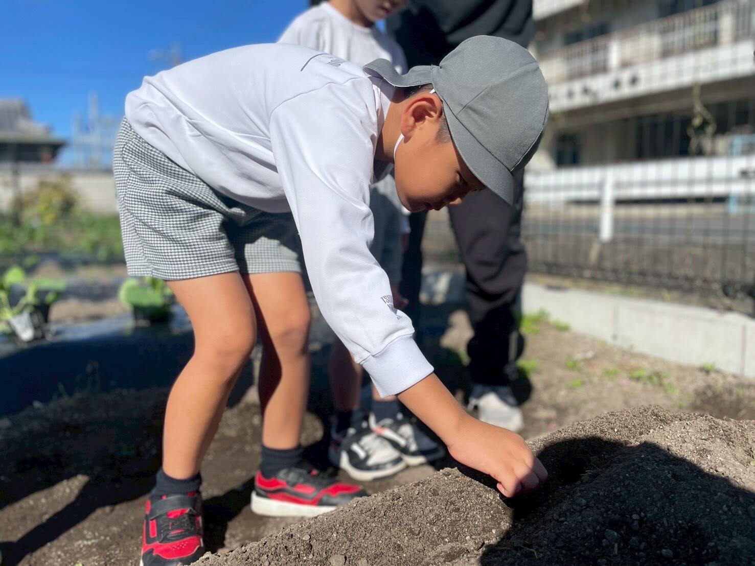 今年のダイシンファームはほうれん草、ネギ、キャベツ、白菜、ちんげん菜の苗を丁寧に植えました。苗植えは「タネの色が違うよ!」「どんな味になるのかな?」と発見や会話も楽しみながら、自然と触れ合う時間に。