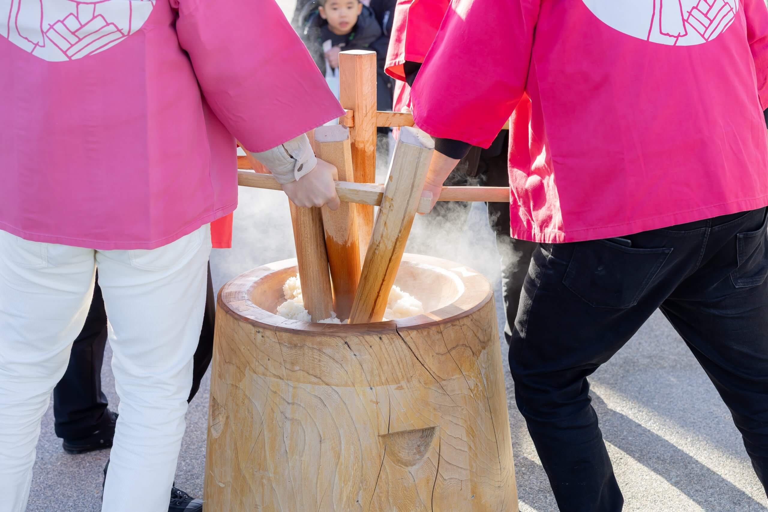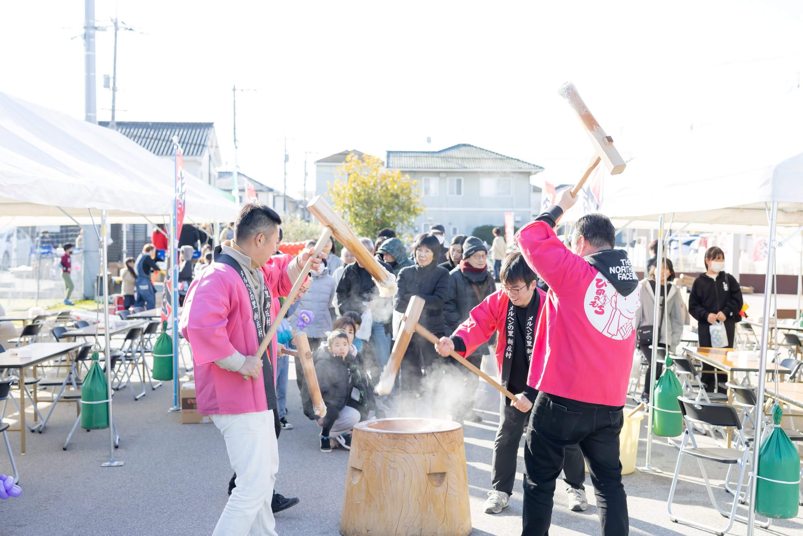 餅つき大会では、先着200名の方に新庄村「ひめのもち10個入り」のお餅がプレゼントされました。新庄村からは新庄ジュニアコーポレートのみなさまにお越しいただき、息の合った餅つきをご披露いただきました!