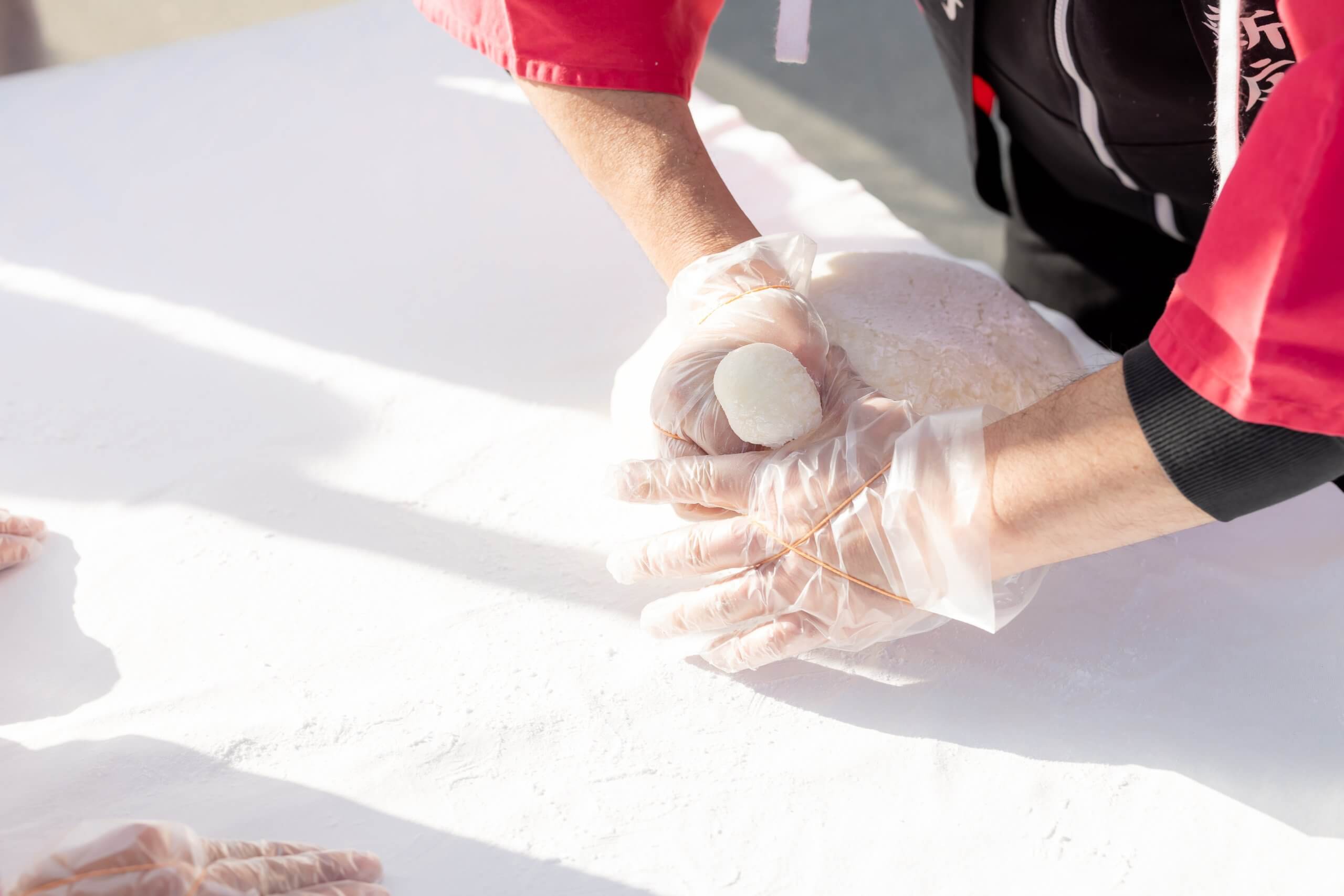 つきたてのお餅は弾力があってとても美味しそう! 新庄村の方が丁寧にこねてくださり、ダイシングループのスタッフや先生方が味付けを担当しました。