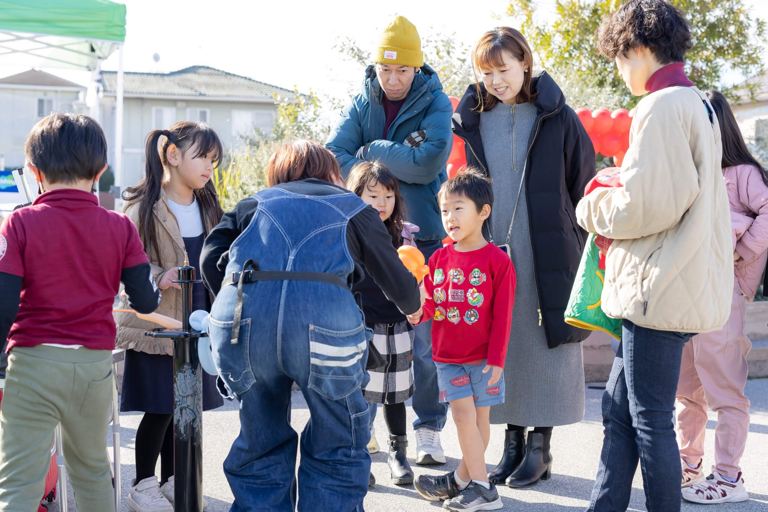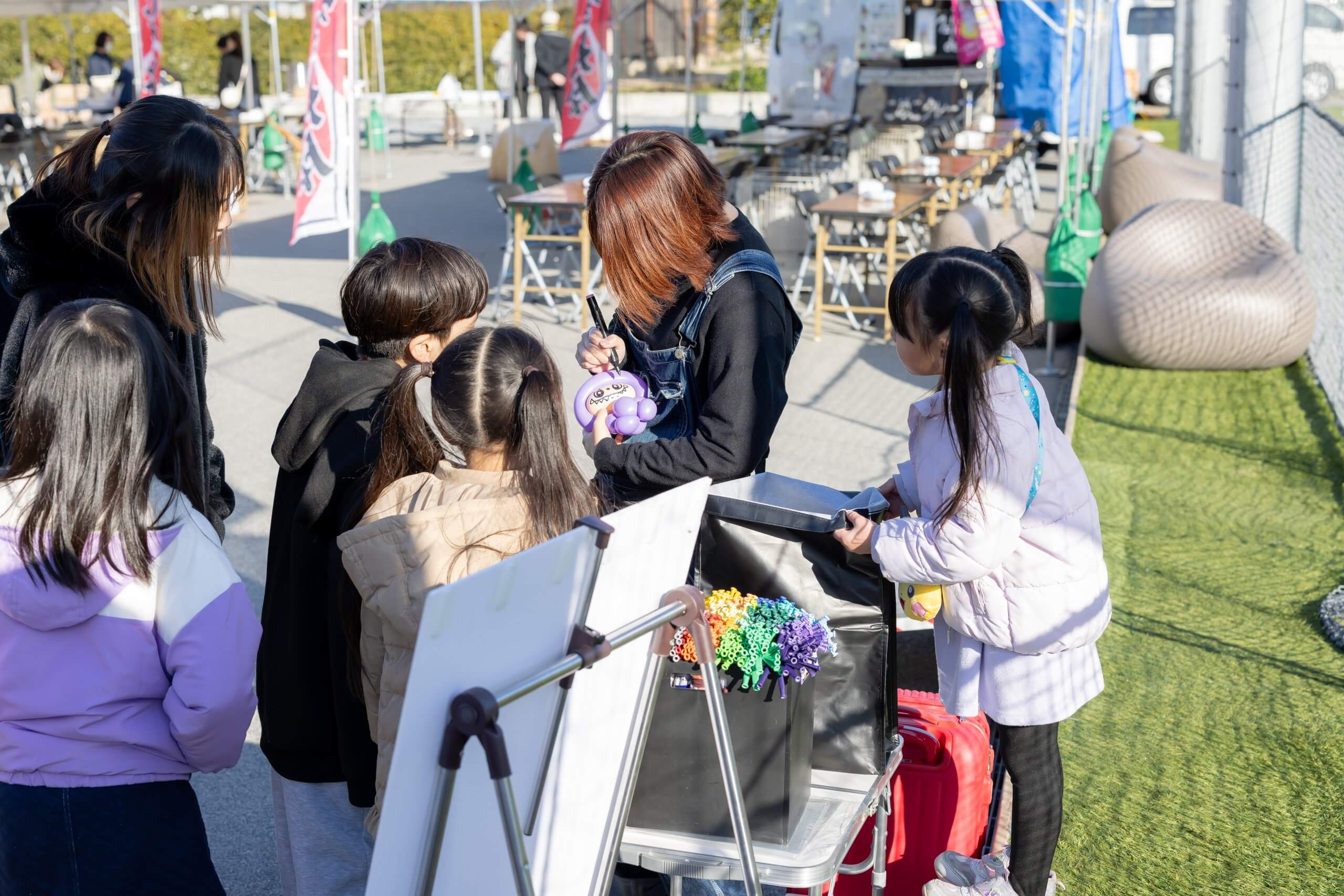 また、バルーンアートコーナーでは、たくさんのキャラクターの中から子どもたちが好きなキャラクターを選び、バルーンアーティストのたっしーさんと楽しそうに会話をしながら完成を楽しみに待っていました。完成したバルーンは、腕につけたりお互いに見せ合って楽しんでいました。